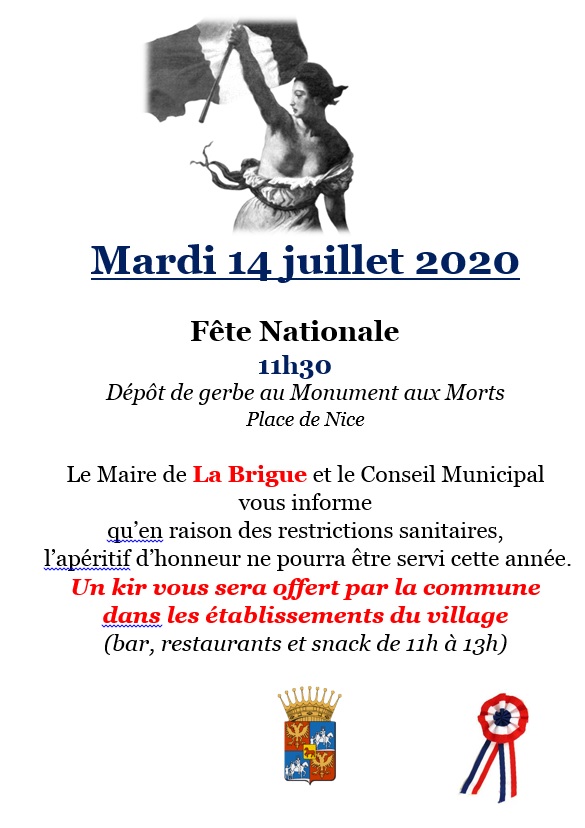 Fête Nationale 11h30 Dépôt de gerbe au Monument aux Morts Place de Nice Le Maire de La Brigue et le Conseil Municipal vous informe qu’en raison des restrictions sanitaires, l’apéritif d’honneur ne pourra être servi cette année. Un kir vous sera offert par la commune dans les établissements du village (bar, restaurants et snack de […]